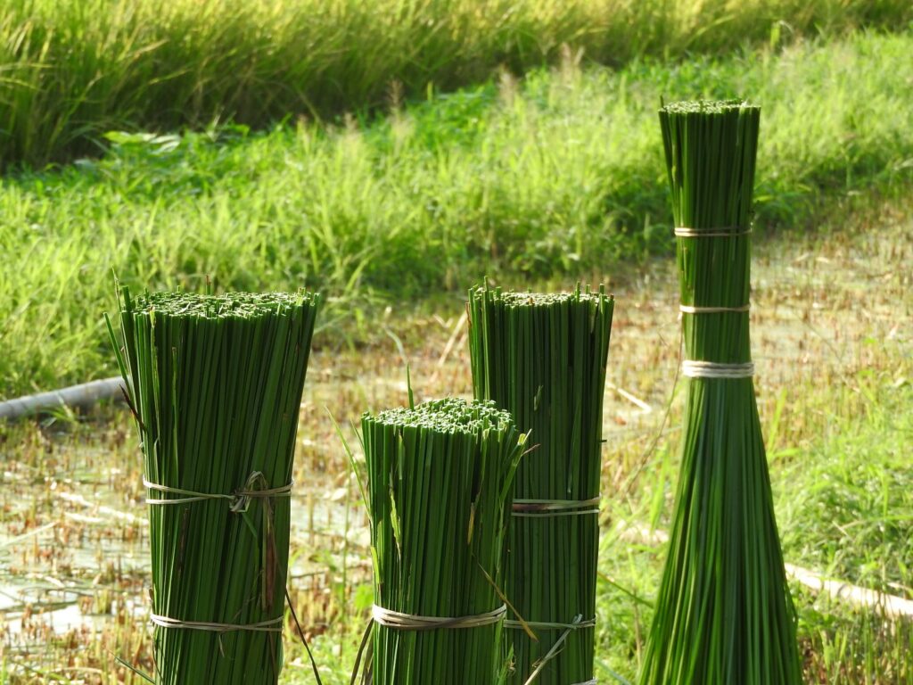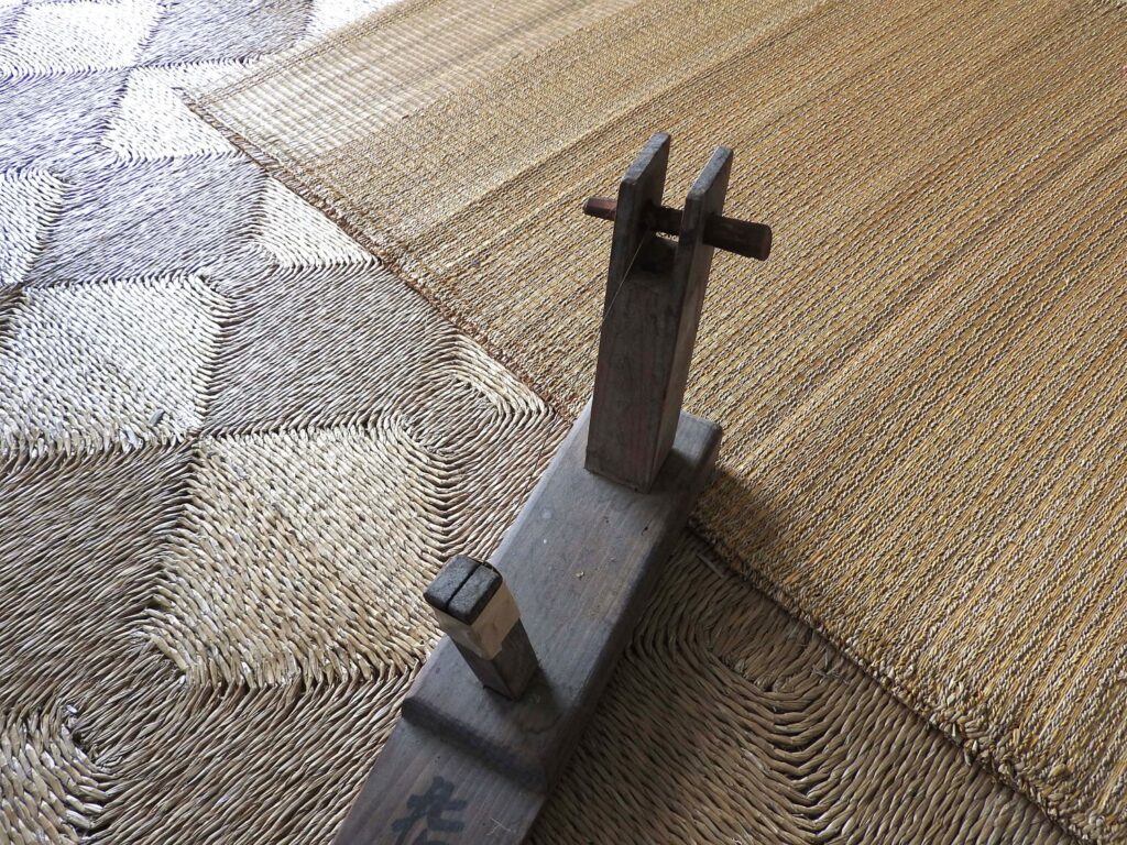 大分の国東半島の安岐地区の数件の農家だけで栽培されている七島藺、以前より興味はあったもののなかなかお目にかかることができなかった。七島藺は畳表の一種で一般的には畳縁の無い琉球畳の元祖と言われている。強度が藺草表の5~6倍あるため、柔道の畳や民家の囲炉裏の廻りなど耐久性が要求される床に使用されていた。近年、藺草畳の普及により、現在では前述の場所で限定的に生産されている。今回、東海機器工業㈱さんの七島藺刈り取りツアーに参加してきました。七島藺は廻りを田に囲まれた一角で栽培されていました。背丈は2m以上にもなり、稲を刈るように刈って背丈を揃え先端をカットします。茎の断面は見事な三角形で二つに割いて乾燥させ、畳表を織りあげます。乾燥藺を手で引っ張り切ろうにもかなり頑丈で切れません。七島藺の生産は細々と続けられているかと思いきや、七島藺畳は手に入らない程引っ張りだこだそうである。七島藺に魅了され、大阪から夫婦で移住して七島藺を育ててらっしゃる方もいらっしゃいました。このツアーで七島藺を良く知ることができたし、有形、無形を問わず衰退しそうな文化を継承するためのヒントもいただきました。2枚目の写真は七島藺表の表情と七島藺の茎を割く道具です。いかにも丈夫そうでしょ!
